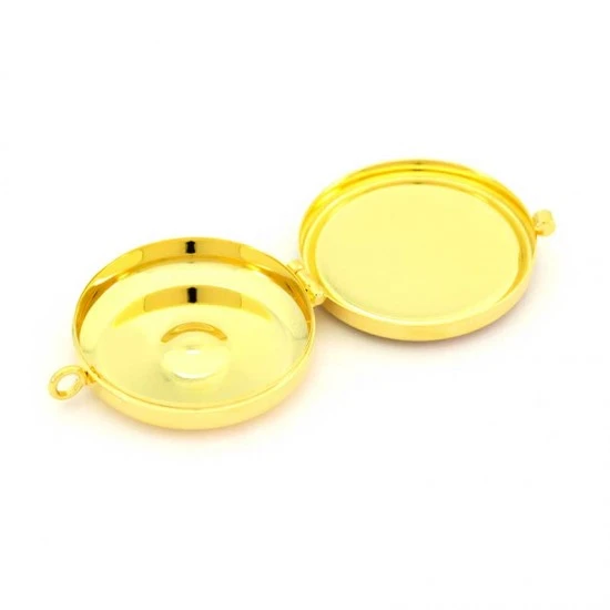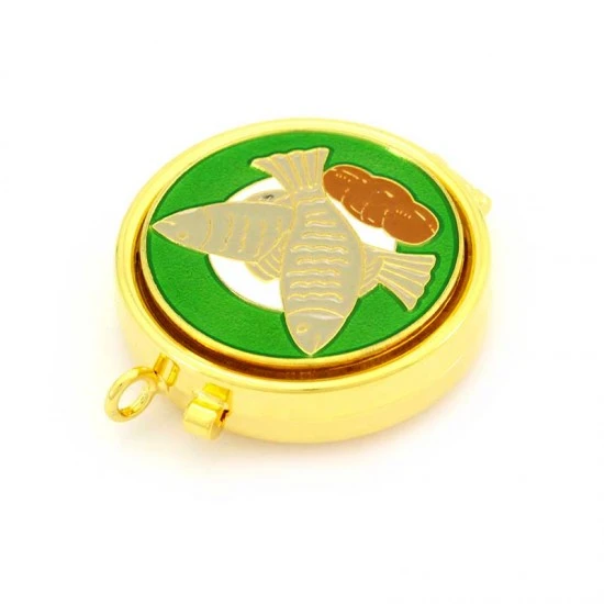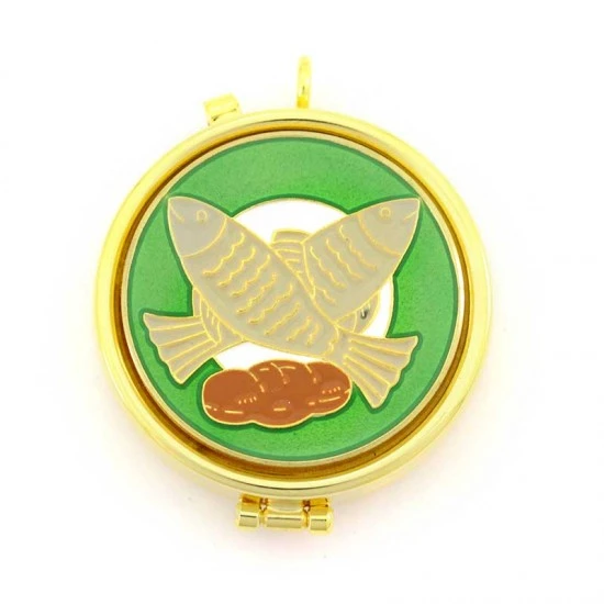 Teca eucaristica realizzata in metallo dorato con chiusura ad incastro, placca smaltata raffigurante i simboli Pane e Pesci. La teca è munita di anello per poterla indossare al collo. Made in Italy