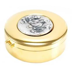 Teca eucaristica realizzata in metallo dorato con chiusura ad incastro. La placca argentata raffigura la simbologia liturgica dell’ Ultima Cena. Made in Italy