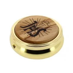 Teca eucaristica con chiusura a scatto, realizzata in metallo dorato con interno in plastica bianca e impreziosita da placca in legno di ulivo raffigurante il simbolo JHS. Made in Italy