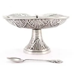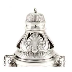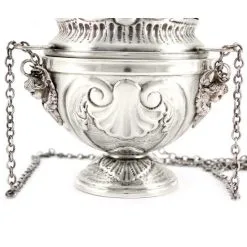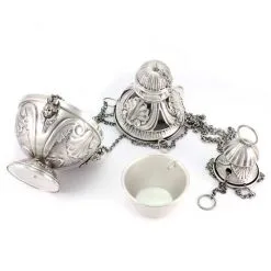 Turibolo con navetta in ottone stile barocco completamente cesellato a mano, realizzati in ottone argentato ossidato. La lavorazione degli ornati viene eseguita con la tecnica del cesello a mano da artigiani specializzati. Il turibolo è corredato di fornello interno estraibile cosi da consentirne l’eventuale sostituzione. La navetta viene fornita con cucchiaino per l’incenso. Made in Italy