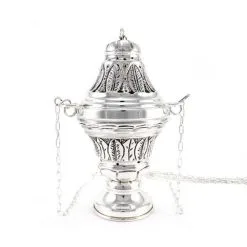 Turibolo con Navetta realizzato in ottone argentato con lavorazione dei fregi eseguita accuratamente a cesello. Particolarmente solenne e ricco su questo turibolo sono raffigurate delle foglie di ulivo lavorate nei minimi dettagli. La lavorazione degli ornati e dei fregi presenti vengono eseguiti con la tecnica del cesello a mano da artigiani che prestano la massima attenzione per le rifiniture dei particolari. Il bagno argentato viene eseguito con micron ad alto spessore che consente di preservare il prodotto nel tempo. Il turibolo è corredato di fornello interno estraibile cosi da consentirne l’eventuale sostituzione. Fornito completo di navetta in stile analogo. Made in Italy