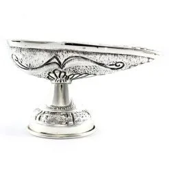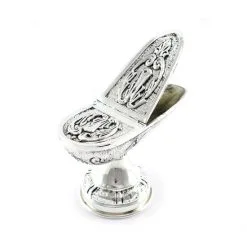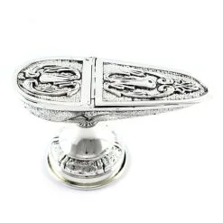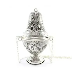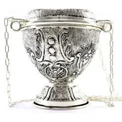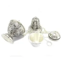 Turibolo con Navetta realizzato in fusione con lavoro di cesello a mano. La lavorazione degli ornati e dei fregi presenti vengono eseguiti con la tecnica del cesello a mano da artigiani che prestano la massima attenzione per le rifiniture dei particolari. Il bagno argentato anticato viene eseguito con micron ad alto spessore che consente di preservare il prodotto nel tempo. Il turibolo è corredato di fornello interno estraibile cosi da consentirne l’eventuale sostituzione, e provvisto di navetta in stile analogo. Made in Italy