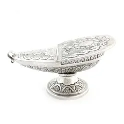 Turibolo con navetta modello cesellato. Realizzato in ottone finitura argentata, fornito con fornello interno estraibile cosi da consentirne l’eventuale sostituzione o la pulizia della stessa. La lavorazione artigianale viene finemente eseguita con la tecnica del cesello a mano donando cosi al turibolo ed alla navetta grande pregio ed originalità. Prodotto da un piccolo laboratorio artigianale di grande esperienza nella lavorazione degli arredi sacri, tutti i materiali utilizzati sono di primissima qualità cosi come l’argentatura che garantisce una grande tenuta nel tempo. Made in Italy