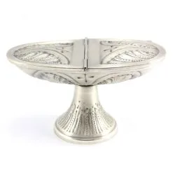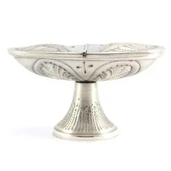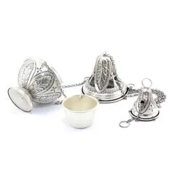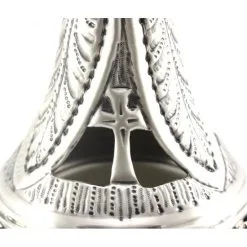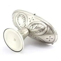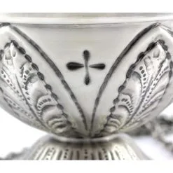 Turibolo con navetta realizzato in ottone finitura argentata, fornito con fornello interno estraibile cosi da consentirne l’eventuale sostituzione o la pulizia della stessa. La lavorazione artigianale viene finemente eseguita con la tecnica del cesello a mano donando cosi al turibolo ed alla navetta grande pregio ed originalità. Fornito completo di cucchiaino per l’incenso. Prodotto da un piccolo laboratorio artigianale di grande esperienza nella lavorazione degli arredi sacri, tutti i materiali utilizzati sono di primissima qualità cosi come l’argentatura che garantisce una grande tenuta nel tempo. Made in Italy