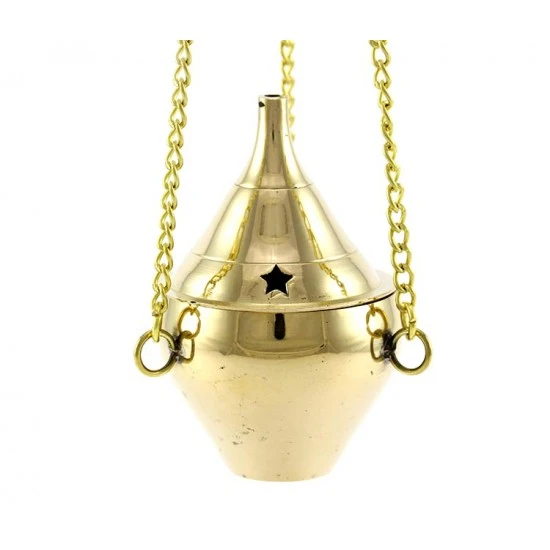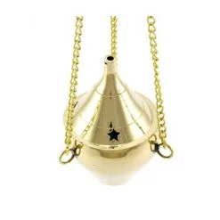 Turibolo Conico piccolo realizzato in ottone dorato, modello classico con catene. Questo prodotto nonostante le piccole dimensioni viene curato nei particolari e si presenta elegante oltre ad essere molto funzionale. Il coperchio presenta diversi fori che oltre ad impreziosire l’estetica del prodotto servono per la fuoriuscita del profumo. Prodotto di importazione di ottima qualità.