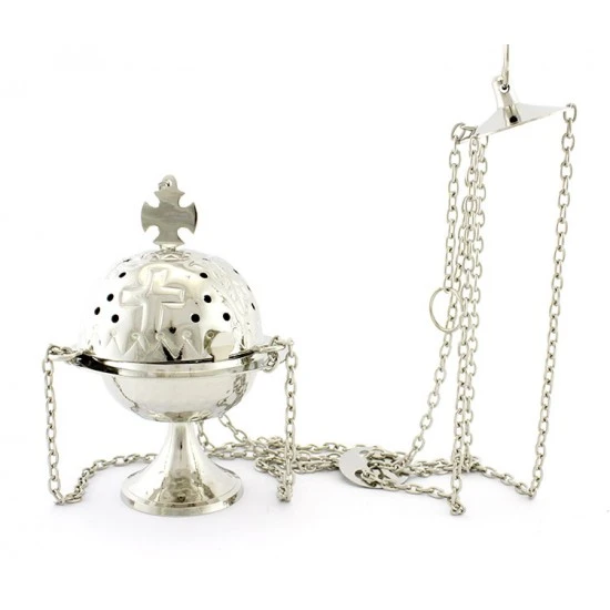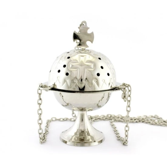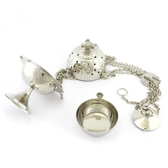 Turibolo Doppia Croce realizzato in ottone argentato martellato. Fornito completo di fornello interno nella quale si inerisce il carbone e l’incenso da ardere. Completo di catene ,sul coperchio presenta una corce incisa e dei piccoli fori a cerchio che oltre ad impreziosire l’estetica del prodotto servono per la fuoriuscita del profumo. Prodotto di importazione di ottima qualità.
