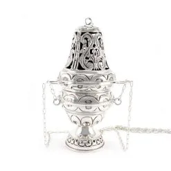 Turibolo e navetta con decoro cerchi realizzato in ottone argentato con lavorazione dei fregi eseguita accuratamente a cesello da artigiani che prestano la massima attenzione per le rifiniture dei particolari. Il bagno argentato viene eseguito con micron ad alto spessore che consente di preservare il prodotto nel tempo. Il turibolo è corredato di fornello interno estraibile cosi da consentirne l’eventuale sostituzione ed è fornito completo di navetta in stile analogo. Made in Italy