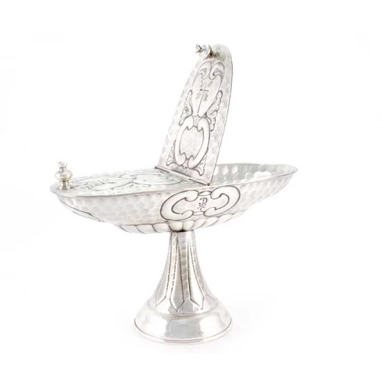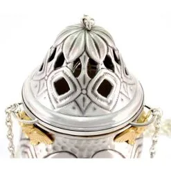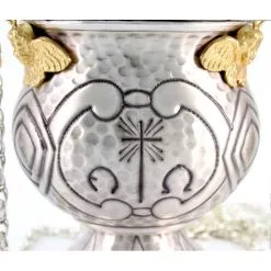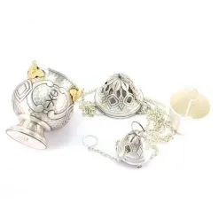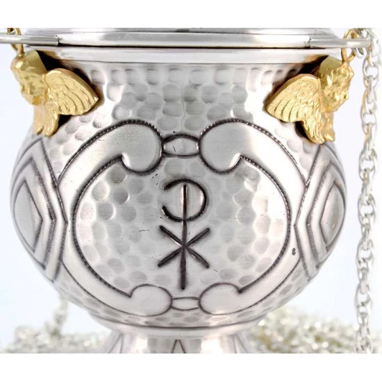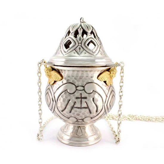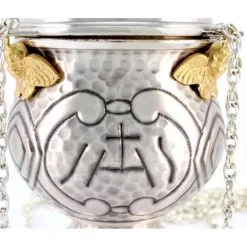 Turibolo e navetta con simboli liturgici. Realizzato in ottone finitura argentata, fornito con fornello interno estraibile cosi da consentirne l’eventuale sostituzione o la pulizia dello stesso. Lavorazione artigianale eseguita finemente con la tecnica del cesello a mano donando cosi al turibolo ed alla navetta grande pregio ed originalità. Prodotto da un piccolo laboratorio artigianale di grande esperienza nella lavorazione degli arredi sacri, tutti i materiali utilizzati sono di primissima qualità cosi come l’argentatura che garantisce una grande tenuta nel tempo. Made in Italy