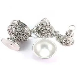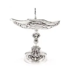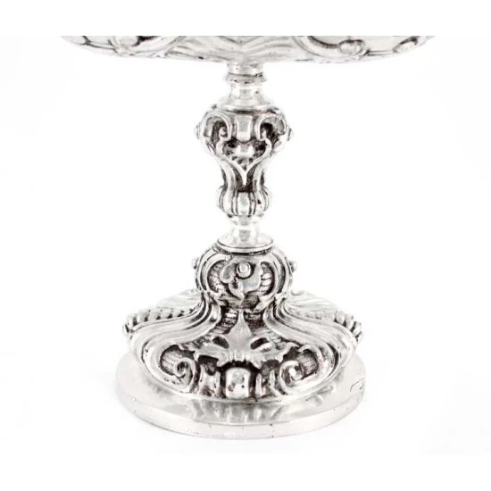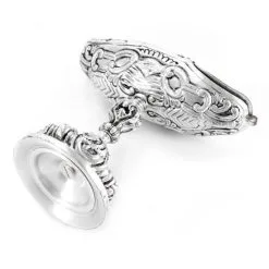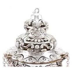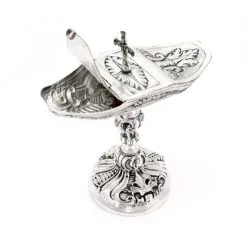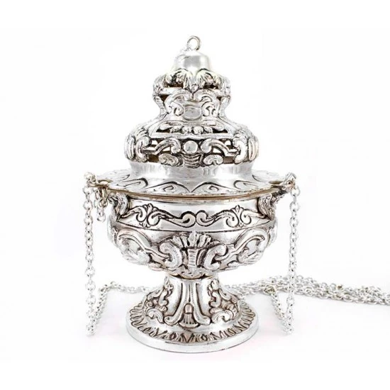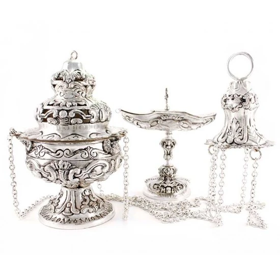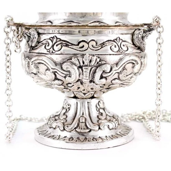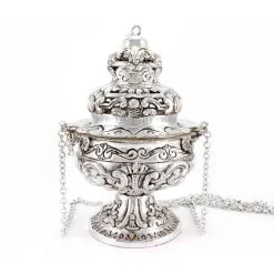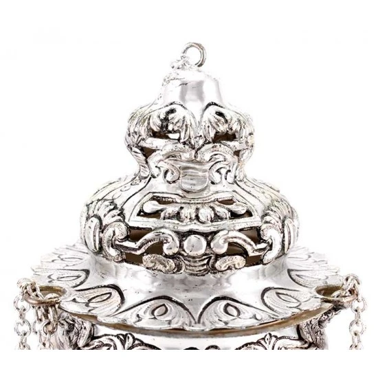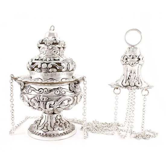 Turibolo e navetta stile barocco. Realizzato in fusione di ottone finitura argentata, fornito con fornello interno estraibile cosi da consentirne l’eventuale sostituzione o la pulizia dello stesso. Lavorazione artigianale eseguita finemente con la tecnica del cesello a mano donando cosi al turibolo ed alla navetta grande pregio ed originalità. Prodotto da un piccolo laboratorio artigianale di grande esperienza nella lavorazione degli arredi sacri, tutti i materiali utilizzati sono di primissima qualità cosi come l’argentatura che garantisce una grande tenuta nel tempo. Made in Italy
