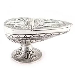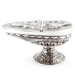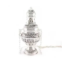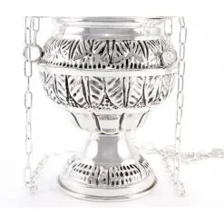 Turibolo con Navetta realizzato in ottone argentato con lavorazione dei fregi eseguita accuratamente a cesello da artigiani che prestano la massima attenzione per le rifiniture dei particolari. Il bagno argentato viene eseguito con micron ad alto spessore che consente di preservare il prodotto nel tempo. Il turibolo è corredato di fornello interno estraibile cosi da consentirne l’eventuale sostituzione ed è fornito completo di navetta in stile analogo. Made in Italy
