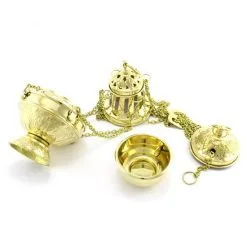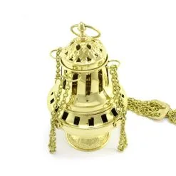 Turibolo grande elica realizzato in metallo dorato con base lavorata. Fornito completo di catene e fornello interno nella quale si inserisce il carbone e l’incenso da ardere. Sul coperchio sono presenti diverse feritoie che oltre a renderlo solenne servono per la fuoriuscita del profumo. Prodotto di importazione di ottima qualità.