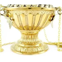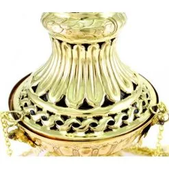 Turibolo grande traforato realizzato in metallo dorato con base lavorata. Fornito completo di catene e fornello interno nella quale si inserisce il carbone e l’incenso da ardere. Sul coperchio sono presenti diverse feritoie che oltre a renderlo solenne servono per la fuoriuscita del profumo. Prodotto di importazione di ottima qualità.