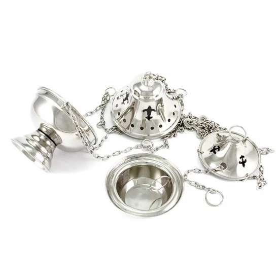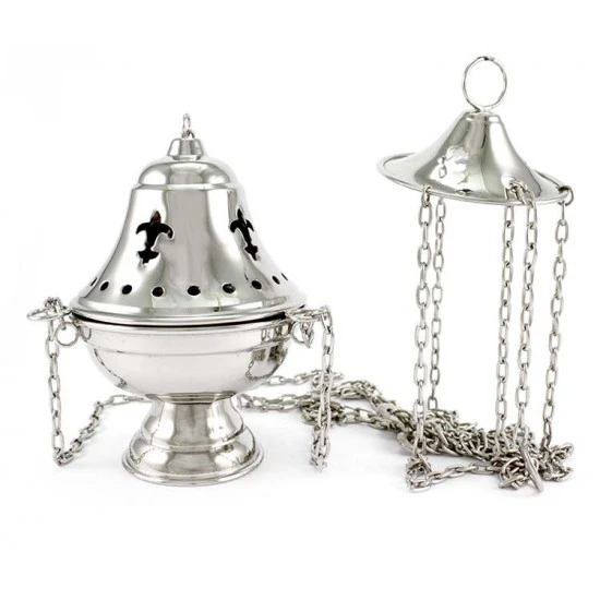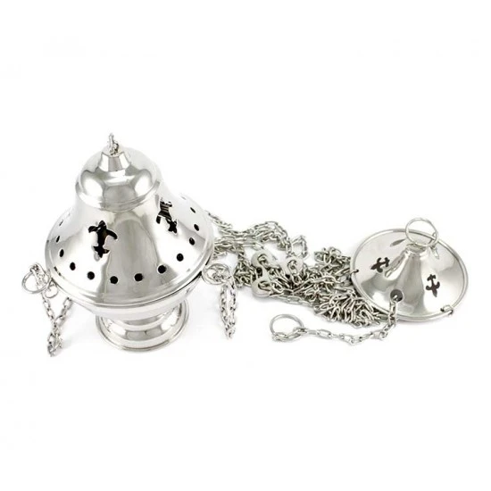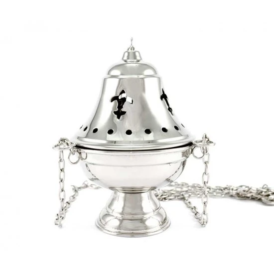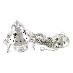 Turibolo liscio realizzato in metallo argentato. Fornito completo di catene e fornello interno nella quale si inserisce il carbone e l’incenso da ardere. Sul coperchio sono presenti diverse feritoie che oltre a renderlo solenne servono per la fuoriuscita del profumo. Prodotto di importazione di ottima qualità.