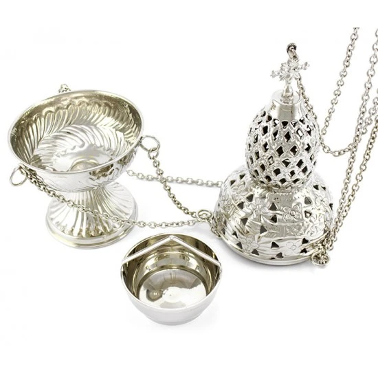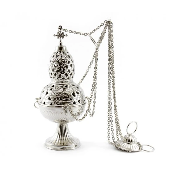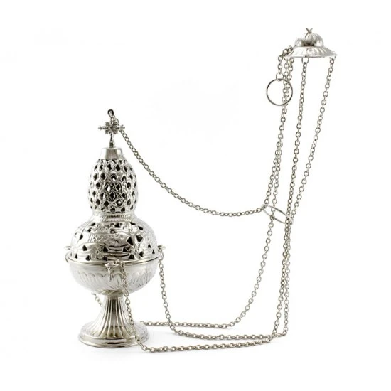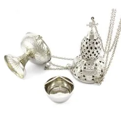 Turibolo Medio realizzato in ottone argentato con lavorazione di fregi e traforo, impreziosito da piccola crocetta superiore. Fornito completo di fornello interno nella quale si inerisce il carbone e l’incenso da ardere. Modello classico completo di catene. Il coperchio presenta diversi fori che oltre ad impreziosire l’estetica del prodotto servono per la fuoriuscita del profumo. Prodotto di importazione di ottima qualità.