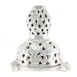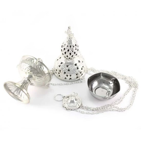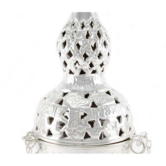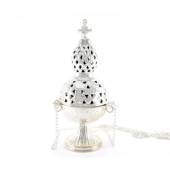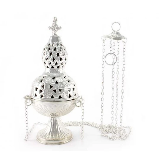 Turibolo Medio realizzato in metallo argentato con lavorazione di fregi e traforo, impreziosito da piccola crocetta superiore. Fornito completo di fornello interno nella quale si inserisce il carbone e l’incenso da ardere. Modello classico completo di catene. Il coperchio presenta diversi fori che oltre ad impreziosire l’estetica del prodotto servono per la fuoriuscita del profumo. Prodotto di importazione di ottima qualità.