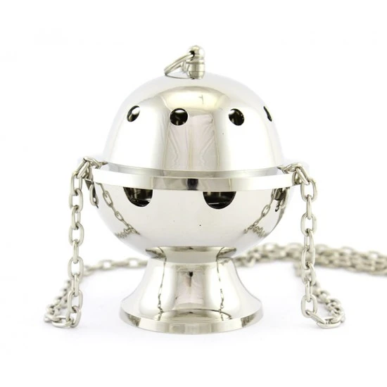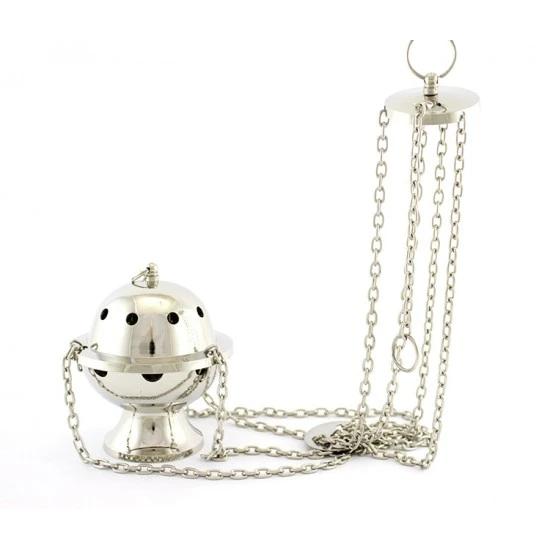 Turibolo Sfera realizzato in ottone argentato liscio. Fornito completo di fornello interno nella quale si inerisce il carbone e l’incenso da ardere. Modello classico completo di catene ,sul coperchio sono presenti diversi fori che oltre ad impreziosire l’estetica del prodotto servono per la fuoriuscita del profumo. Prodotto di importazione di ottima qualità.