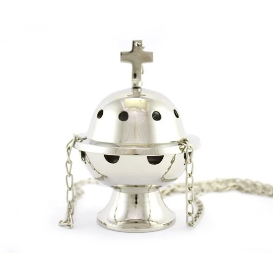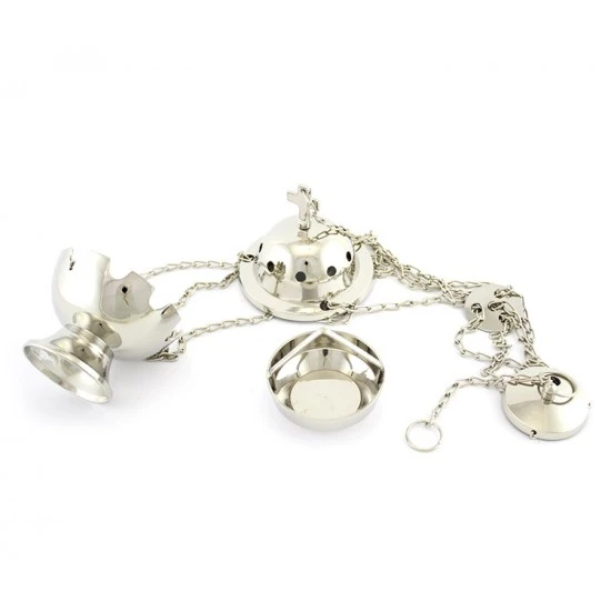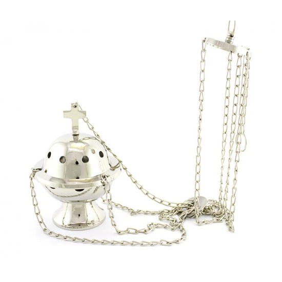Turibolo Sfera forato realizzato in ottone argentato liscio. Fornito completo di fornello interno nella quale si inerisce il carbone e l’incenso da ardere. Completo di catene ,sul coperchio presenta una serie di piccoli fori a cerchio che oltre ad impreziosire l’estetica del prodotto servono per la fuoriuscita del profumo. Prodotto di importazione di ottima qualità.