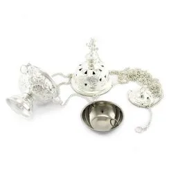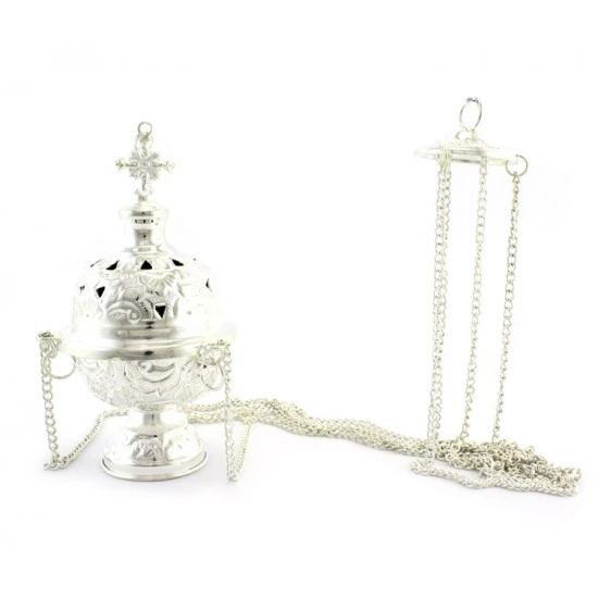 Turibolo Traforato realizzato in ottone argentato con piccola crocetta superiore. Fornito completo di fornello interno nella quale si inerisce il carbone e l’incenso da ardere. Modello classico completo di catene. Il coperchio presenta diversi fori che oltre ad impreziosire l’estetica del prodotto servono per la fuoriuscita del profumo. Prodotto di importazione di ottima qualità.