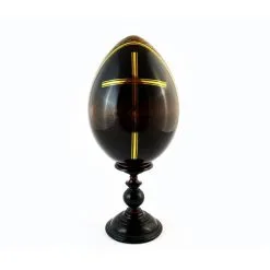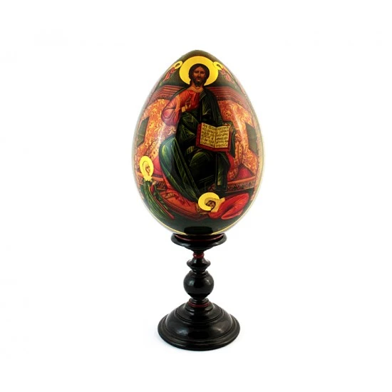 Uovo in legno dipinto completamente a mano con raffigurazione del Cristo Pantocratore con Maria Maddalena e Angeli. I colori dell’immagine sono patinati e con riporti in oro mentre il retro è di color legno verniciato con una croce dorata. La base è in legno lucido. Made in Russia.