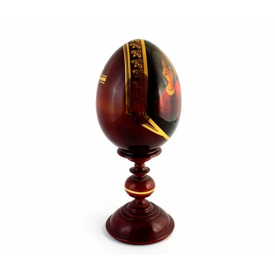 Uovo in legno dipinto completamente a mano con raffigurazione di Cristo Re Benedicente. I colori dell’immagine sono patinati e con riporti in oro mentre il retro è di color legno verniciato con una croce dorata. La base è in legno lucido. Fornito compreso di supporto in legno. Made in Russia