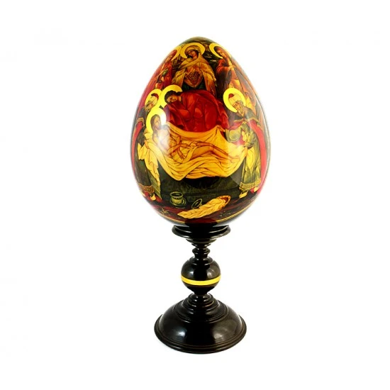 Uovo in legno dipinto completamente a mano con raffigurazione della deposizione di Cristo con Maria Addolorata. I colori dell’immagine sono patinati e con riporti in oro mentre il retro è di color legno verniciato con una croce dorata. La base è in legno lucido. Fornito compreso di supporto in legno. Made in Russia.
