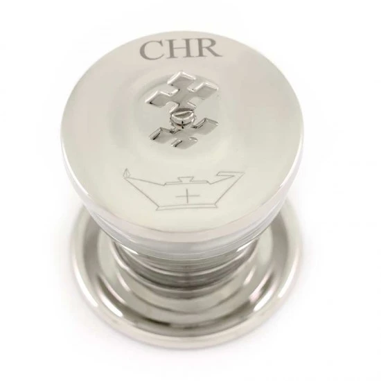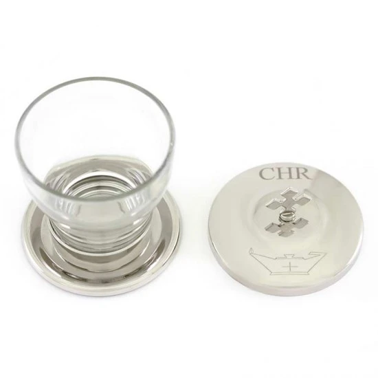 Vasetto per olio Santo Crisma realizzato in vetro e metallo nichelato munito di coperchio con scritta incisa. Prodotto di ottima fattura e ben rifinito. Made in Italy