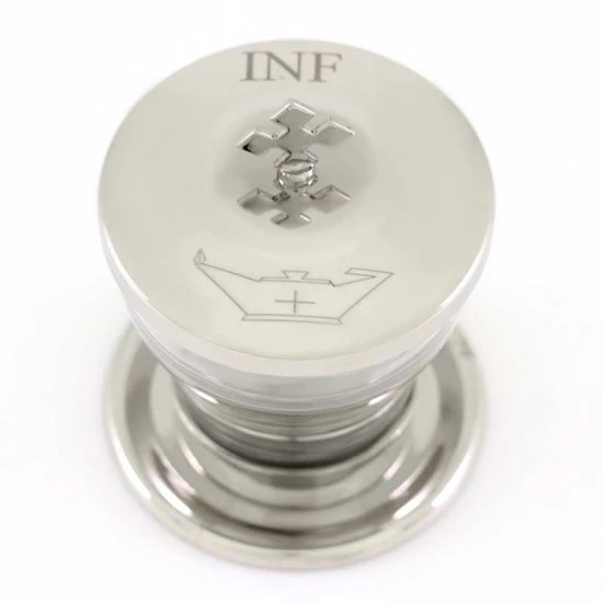 Vasetto per olio Santo Infermi realizzato in vetro e metallo nichelato munito di coperchio con scritta incisa. Prodotto di ottima fattura e ben rifinito. Made in Italy