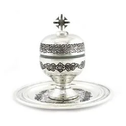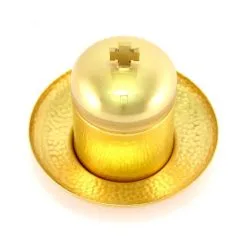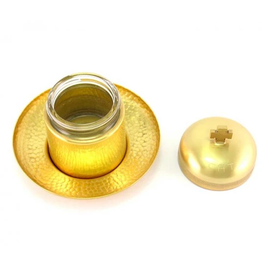 Vasetto per olio Santo Catecumeni realizzato in metallo dorato martellato con piattino inglobato e interno in vetro. Sistema di apertura sicuro e pratico con filettatura, svita e avvita. Made in Italy