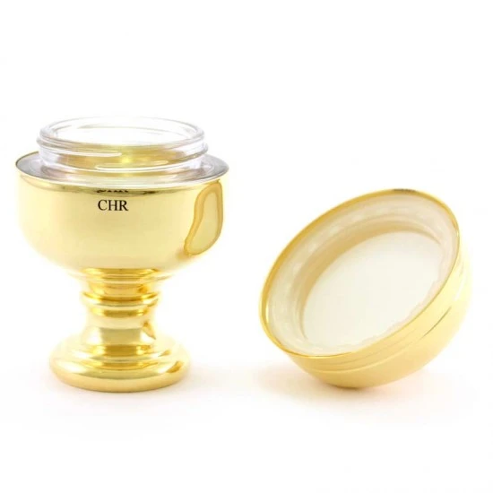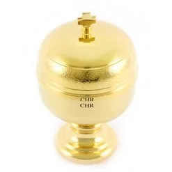 Vasetto per olio Santo Crisma realizzato in metallo dorato liscio con interno in vetro. Sistema di apertura sicuro e pratico con filettatura, svita e avvita, munito di coperchio in plastica bianca per evitare perdite. Made in Italy