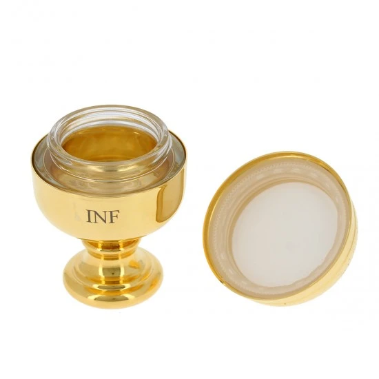 Vasetto per olio Santo Infermi realizzato in metallo dorato liscio con interno in vetro. Sistema di apertura sicuro e pratico con filettatura, svita e avvita, munito di coperchio in plastica bianca per evitare perdite. Made in Italy
