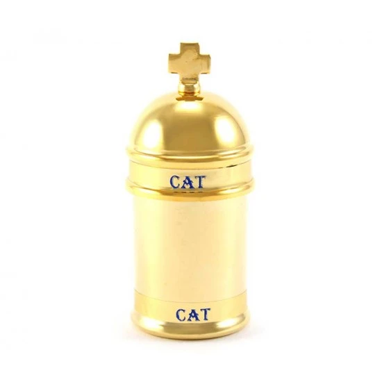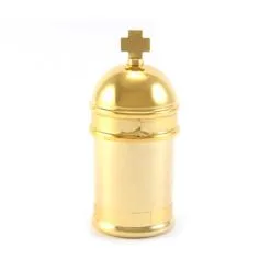 Vasetto per olio Santo Catecumeni realizzato in ottone dorato con interno in vetro estraibile. Il tappo è decorato con una crocetta piatta ed ha un sistema di apertura sicuro e pratico con filettatura, svita e avvita. Made in Italy