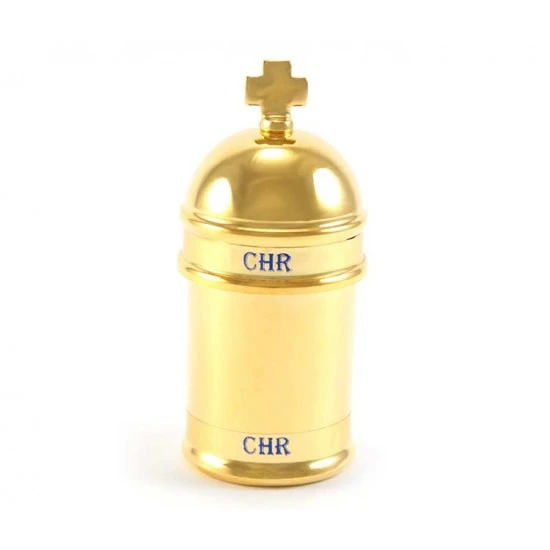 Vasetto per olio Santo Crisma realizzato in ottone dorato con interno in vetro estraibile. Il tappo è decorato con una crocetta piatta ed ha un sistema di apertura sicuro e pratico con filettatura, svita e avvita. Confezionato in astuccio con chiusura a ciappetta. Made in Italy