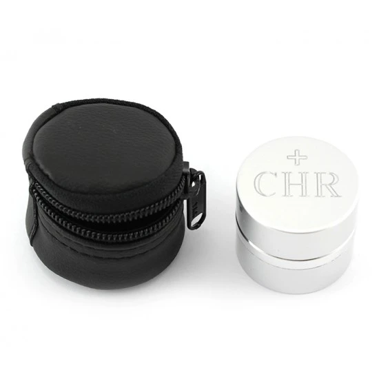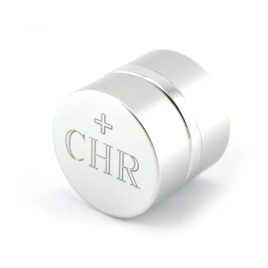 Vasetto per olio Santo Crisma realizzato in alluminio argentato. Il tappo è decorato da una crocetta incisa e la scritta CHR, ed ha un sistema di apertura sicuro e pratico con filettatura, svita e avvita, fornito di astuccio in pelle. Made in Italy