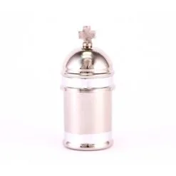 Vasetto per olio Santo Crisma realizzato in ottone argentato con interno in vetro estraibile. Il tappo è decorato con una crocetta piatta ed ha un sistema di apertura sicuro e pratico con filettatura, svita e avvita. Made in Italy
