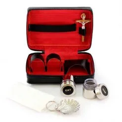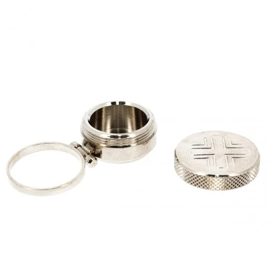 Vasetto per olio Santo con anello realizzato in metallo argentato. Sistema di apertura sicuro e pratico con filettatura, svita e avvita. Fornito completo di astuccio con chiusura a ciappetta. Made in Italy